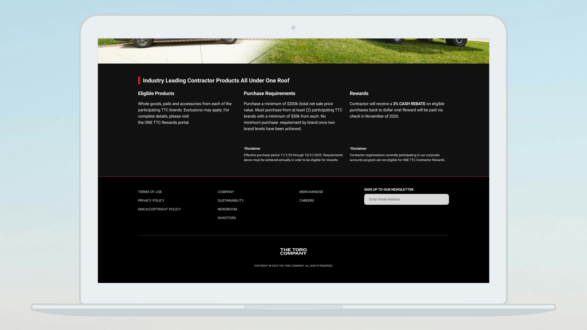 - Created a unified landing page at onettc.com/contractor that consolidates all brand incentive programs in one place.